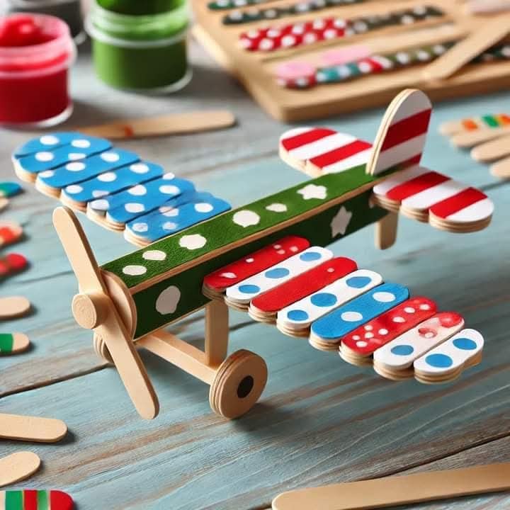 Xếp que kem chồng lên nhau tạo thân máy bay. Gắn thêm hai que ngang làm cánh. Sơn màu và trang trí để hoàn thiện sản phẩm.