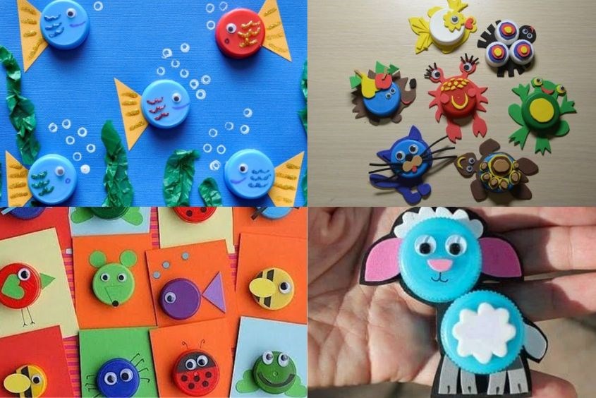 Sắp xếp nắp chai thành hình con sâu, con bướm hoặc các con vật khác. Dán giấy tạo cánh, chân và vẽ thêm mắt, miệng để hoàn thiện.