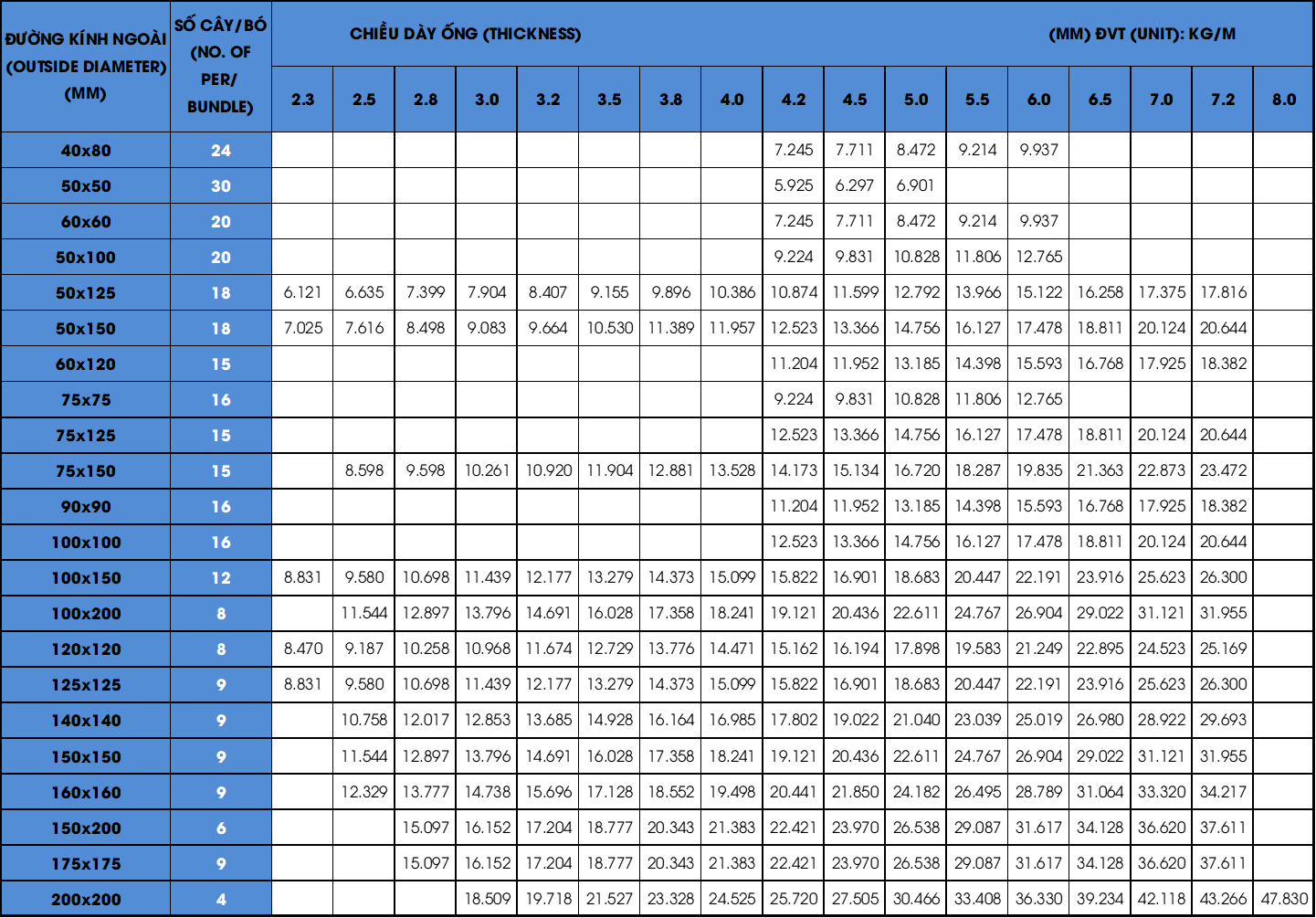 | Quy cách (mm) | Độ dày (mm) | Trọng lượng (kg/cây) | Giá cây 6 m (VNĐ) |