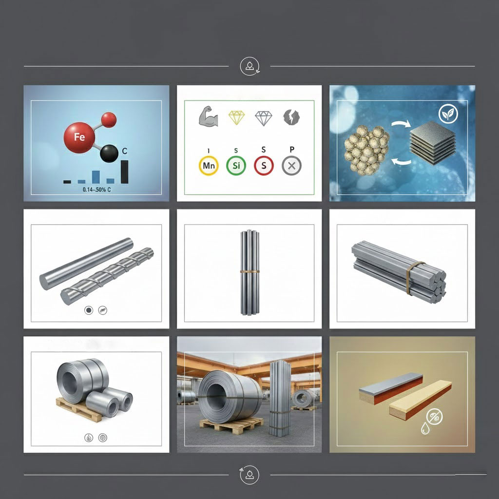 Thép xây dựng là hợp kim chủ yếu giữa sắt (Fe) và carbon (C), trong đó hàm lượng carbon thường nằm trong khoảng 0,14% - 0,30%. Hàm lượng carbon thấp giúp thép có độ dẻo cao, dễ uốn và dễ gia công, phù hợp cho các kết cấu bê tông cốt thép.